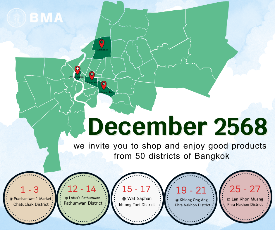 🎉 This December, we invite you to shop and enjoy good products from 50 districts of Bangkok 🛍️ Bangkok Brand & Made in Bangkok products 🥦 Fresh agricultural goods • 🍲 Delicious food at affordable prices 📍 1–3 Dec. @ Prachaniwet 1 Market, Chatuchak District https://share.google/XYmvztxSEjTcbBL4d 📍12-14 Dec. @ Lotus’s