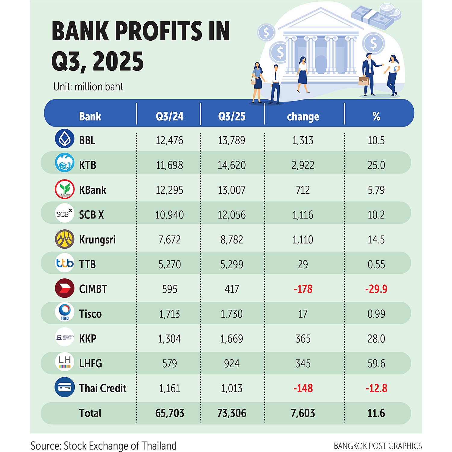 The 11 banks listed on the Stock Exchange of Thailand reported a combined consolidated net profit of 73.3 billion baht, up 11.6% year-on-year.